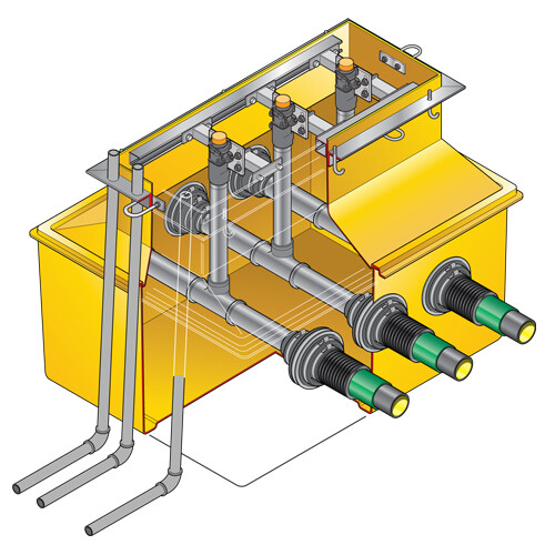 1100mm x 800mm x 825mm (43″ x 32″ x 32″) deep dispenser sump and corbel to fit Wayne Ovation dispenser models. Includes dispenser support rails and shear valve/pipework support rails.